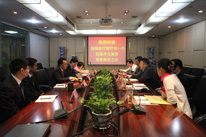 首先,趙董事長對謝廳長一行的來訪表示了熱烈歡迎,并感謝省商務(wù)廳一直以來對開元集團的支持與政策指導(dǎo)。緊接著,趙董事長就集團各個業(yè)務(wù)板塊的發(fā)展情況向謝廳長作了全面詳實的報告,重點介紹了集團境外投資的情況,他指出,開元集團是四川省“走出去”的代表企業(yè),在老撾、緬甸、加拿大都有投資項目或意向,特別是老撾鉀鹽礦項目,目前已實現(xiàn)一期投產(chǎn),二期工程建設(shè)也已全面啟動。針對老撾項目,希望省商務(wù)廳給予更多的政策與資金支持。